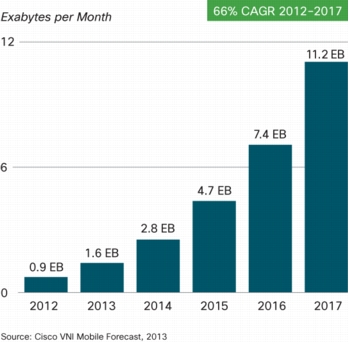 By the end of 2013, there will be more devices on the planet than people (although, of course, this will not mean that everyone has a device). Looking further ahead, by 2017, two-thirds of mobile traffic is expected to be video, and mobile tablets will account for more traffic than the entire network did in 2012. As stated above, offload traffic will also continue to grow, and could be almost equivalent to all cell traffic by 2017! To keep pace with advancing technology, connection speeds on mobile devices will more than triple by that time, fueled mainly by growth in developing markets.