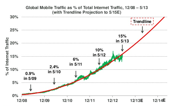 Mobile devices account for 15% of all global Internet traffic, as of this writing. If the trendline holds, it will reach 30% by 2015. For reference, at this same point just four years ago, it was less than 1%.