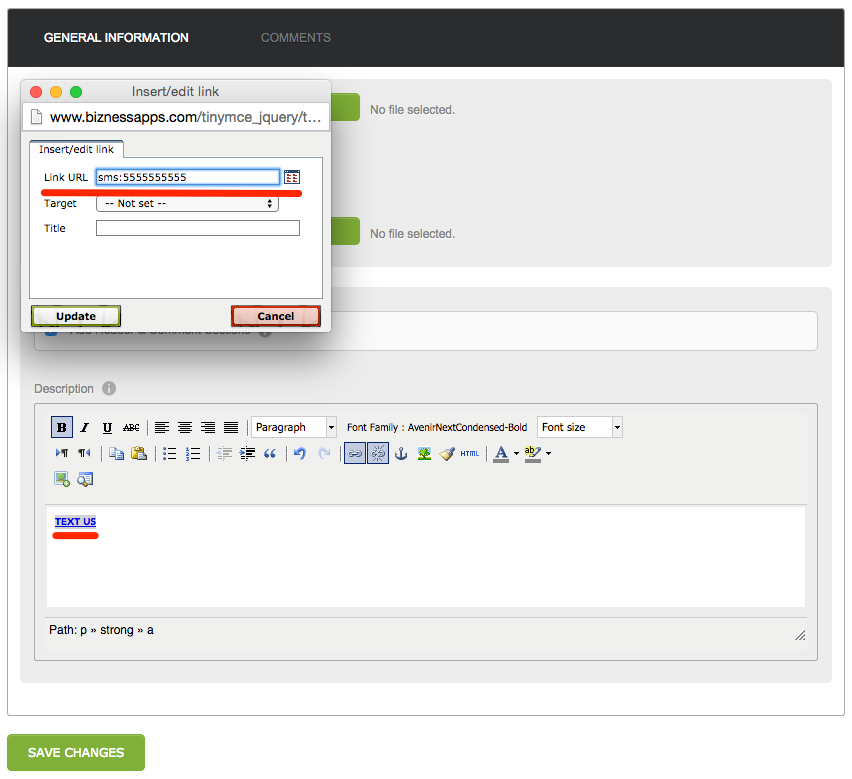 Anywhere on the Bizness Apps platform you see the WYSIWYG (What You See Is What You Get) editor you can create a link to start a phone call, send a text, or send an email! There are two ways to achieve this: using the Link or HTML options in the editing panel. With either method, you can create linkable text or images.
