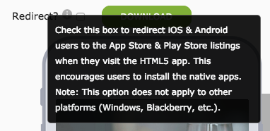 5. If you'd like to direct iOS and Android users to the native apps when they view your HTML5 app, you can check the Redirect box at the top left. This will take them straight to the App Store or Play Store URL provided in the App Information section when they visit the HTML5 app. Leave this box unchecked if you'd like to allow iOS and Android users to view your HTML5 app.